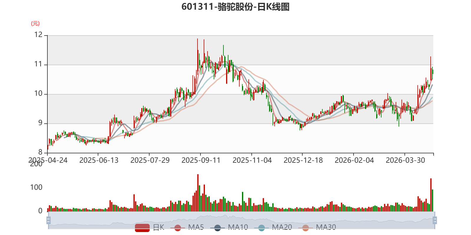 中证智能财讯骆驼股份(601311)4月24日披露2026年第一季度报告。公司实现营业总收入38.52亿元,同比下降6.88%;归母净利润1.59亿元,同比下降32.71%;扣非净利润1.66亿元,同比下降19.08%;经营活动产生的现金流量净额为-2.7亿元,上年同期为-2.9亿元;报告期内,骆驼股份基本每股收益为0.14元,加权平均净资产收益率为1.57%。