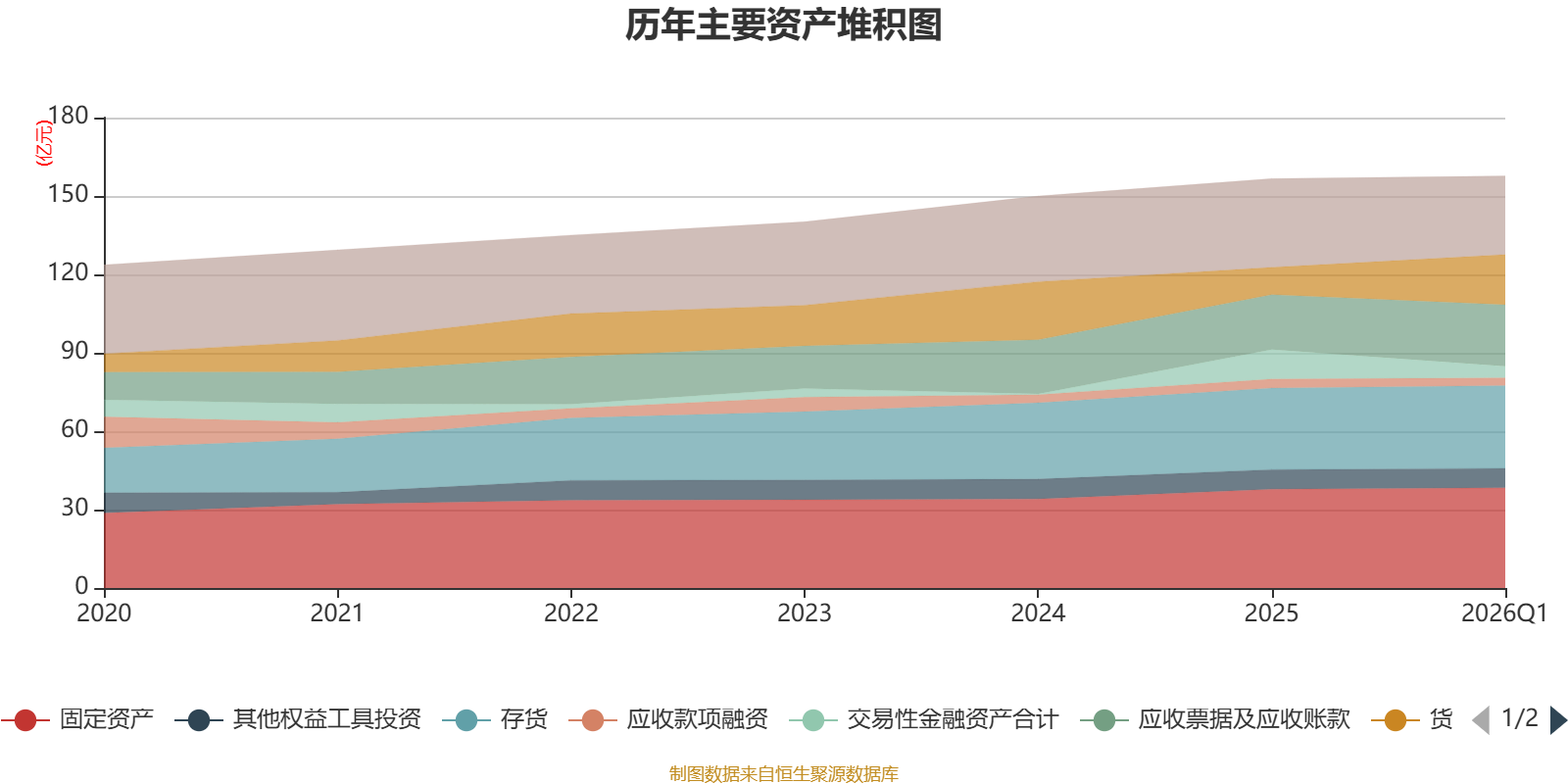 资产重大变化方面,截至2026年一季度末,公司货币资金较上年末增加83.55%,占公司总资产比重上升5.51个百分点;交易性金融资产合计较上年末减少60.63%,占公司总资产比重下降4.38个百分点;其他流动资产较上年末减少40.28%,占公司总资产比重下降1.84个百分点;应收票据及应收账款较上年末增加11.96%,占公司总资产比重上升1.51个百分点。