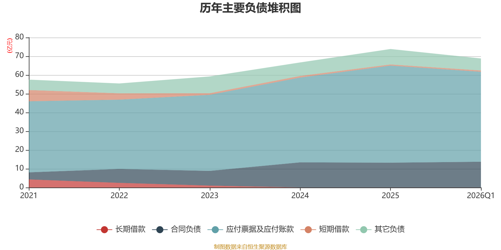 负债重大变化方面,截至2026年一季度末,公司应付票据及应付账款较上年末减少7.39%,占公司总资产比重下降1.76个百分点;合同负债较上年末增加3.78%,占公司总资产比重上升0.81个百分点;其他应付款(含利息和股利)较上年末减少35%,占公司总资产比重下降0.7个百分点;应交税费较上年末减少52.71%,占公司总资产比重下降0.59个百分点。