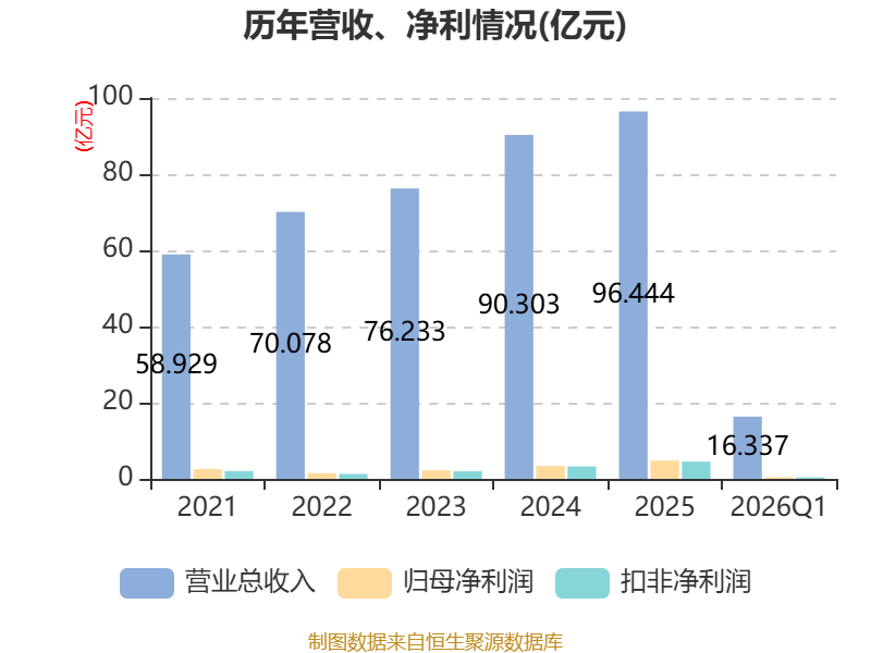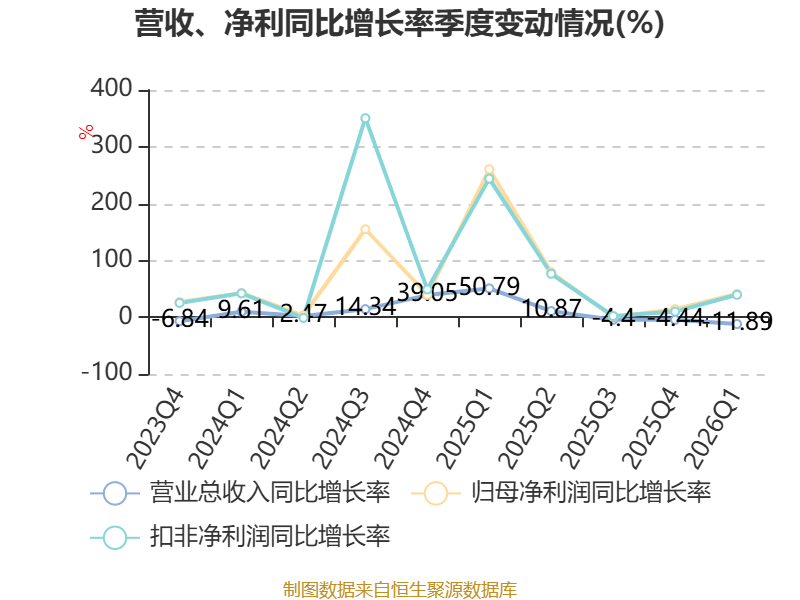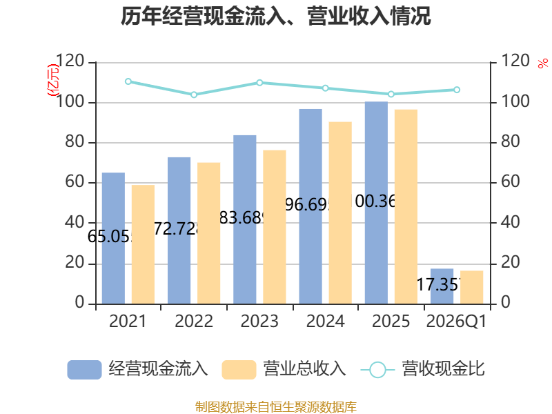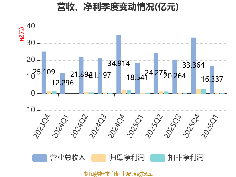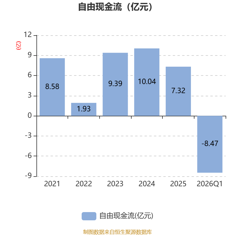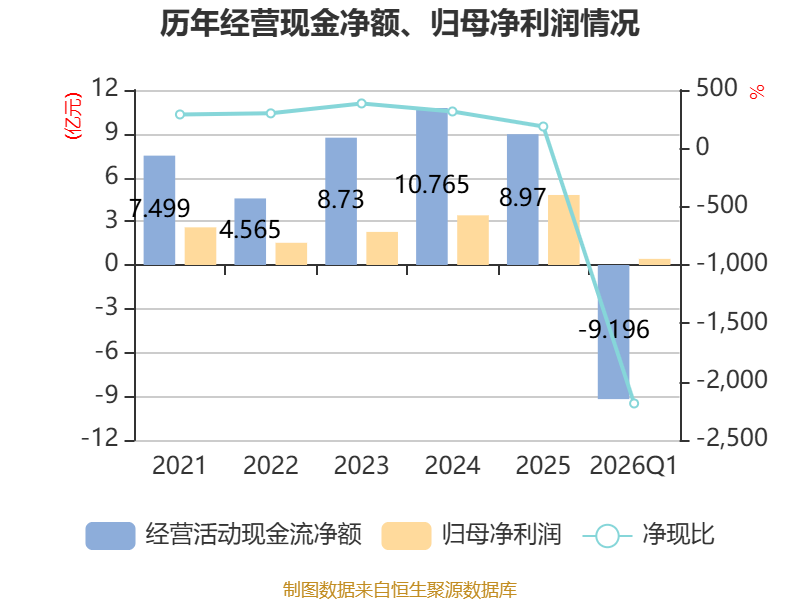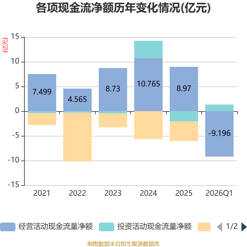 截至2026年一季度末,公司经营活动现金流净额为-9.2亿元,同比减少7.18亿元;筹资活动现金流净额-720.73万元,同比增加328.81万元;投资活动现金流净额1.33亿元,上年同期为-1294.69万元。