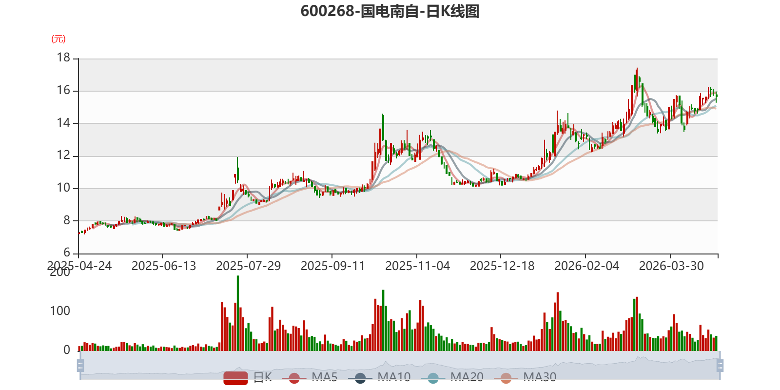 中证智能财讯国电南自(600268)4月24日披露2026年第一季度报告。公司实现营业总收入16.34亿元,同比下降11.89%;归母净利润4205.41万元,同比增长41.10%;扣非净利润3976.47万元,同比增长39.59%;经营活动产生的现金流量净额为-9.2亿元,上年同期为-2.01亿元;报告期内,国电南自基本每股收益为0.04元,加权平均净资产收益率为1.12%。