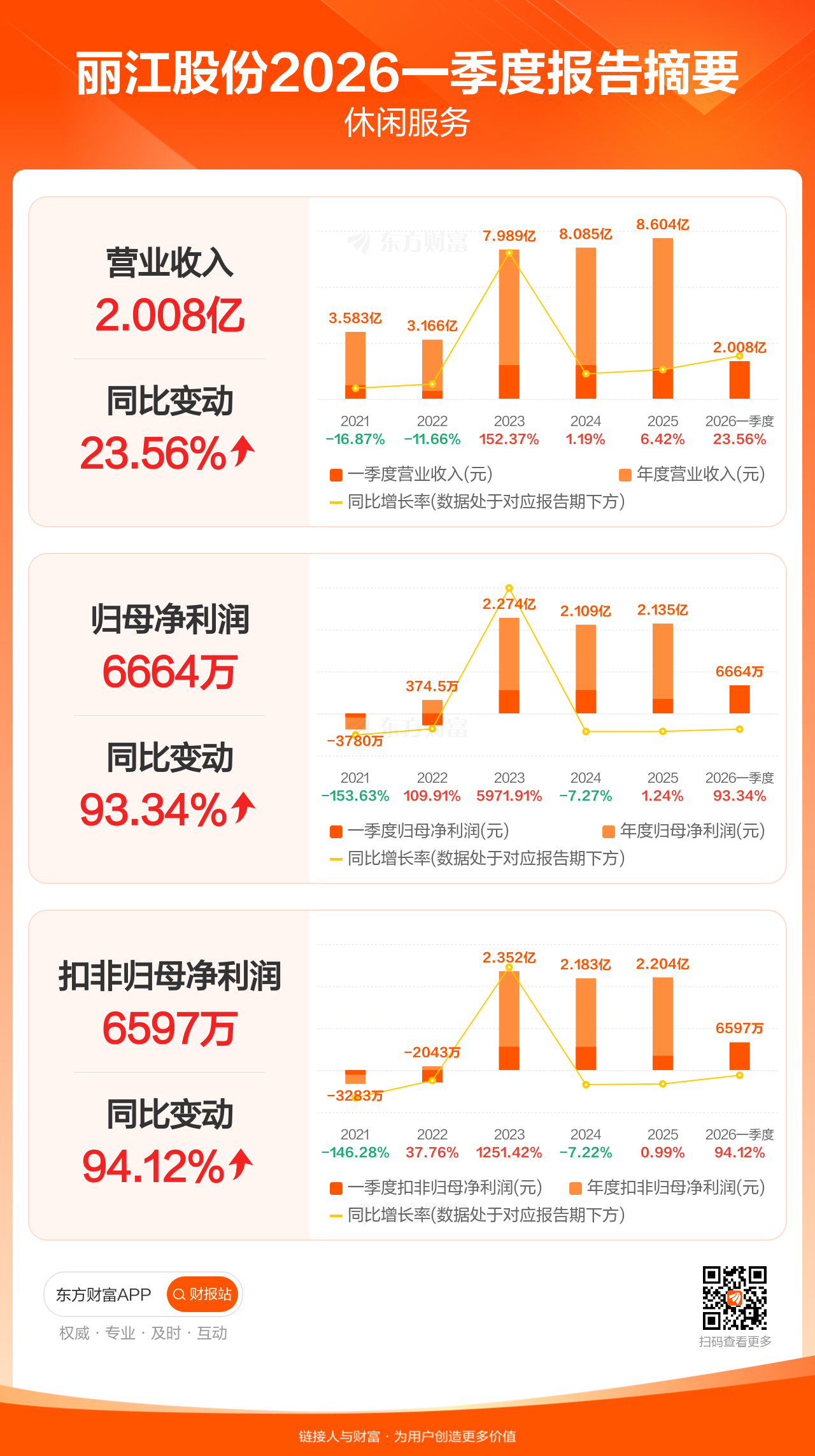 丽江股份4月24日发布2026年一季报显示,公司一季度实现营业收入2.01亿元,同比增长23.56%;归母净利润6663.82万元,同比增长93.34%;扣非归母净利润6597.17万元,同比增长94.12%。