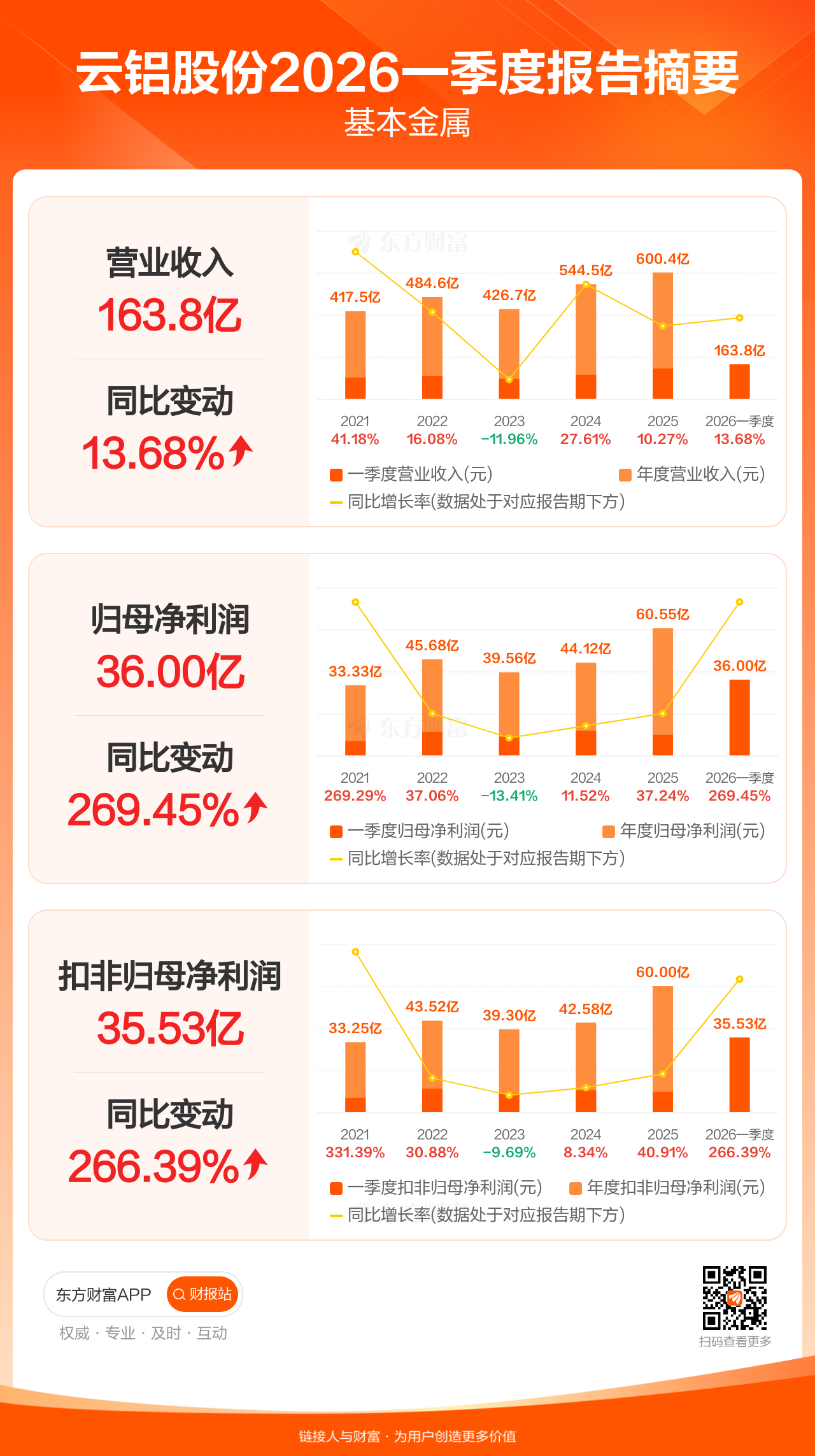 云铝股份4月24日发布2026年一季报显示,公司一季度实现营业收入163.83亿元,同比增长13.68%;归母净利润36.00亿元,同比增长269.45%;扣非归母净利润35.53亿元,同比增长266.39%。