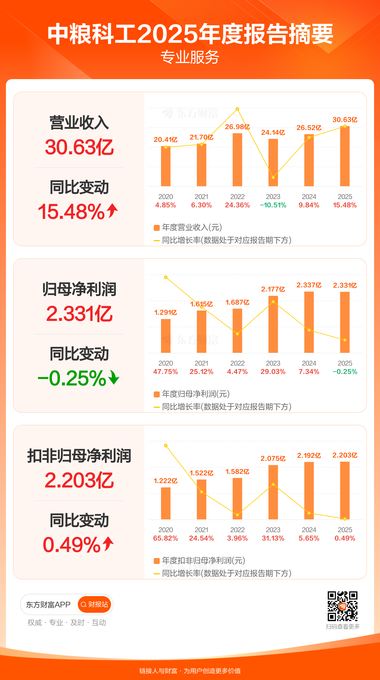 中粮科工4月24日发布2025年年报显示,公司全年实现营业收入30.63亿元,同比增长15.48%;归母净利润2.33亿元,同比下滑0.25%;扣非归母净利润2.20亿元,同比增长0.49%。