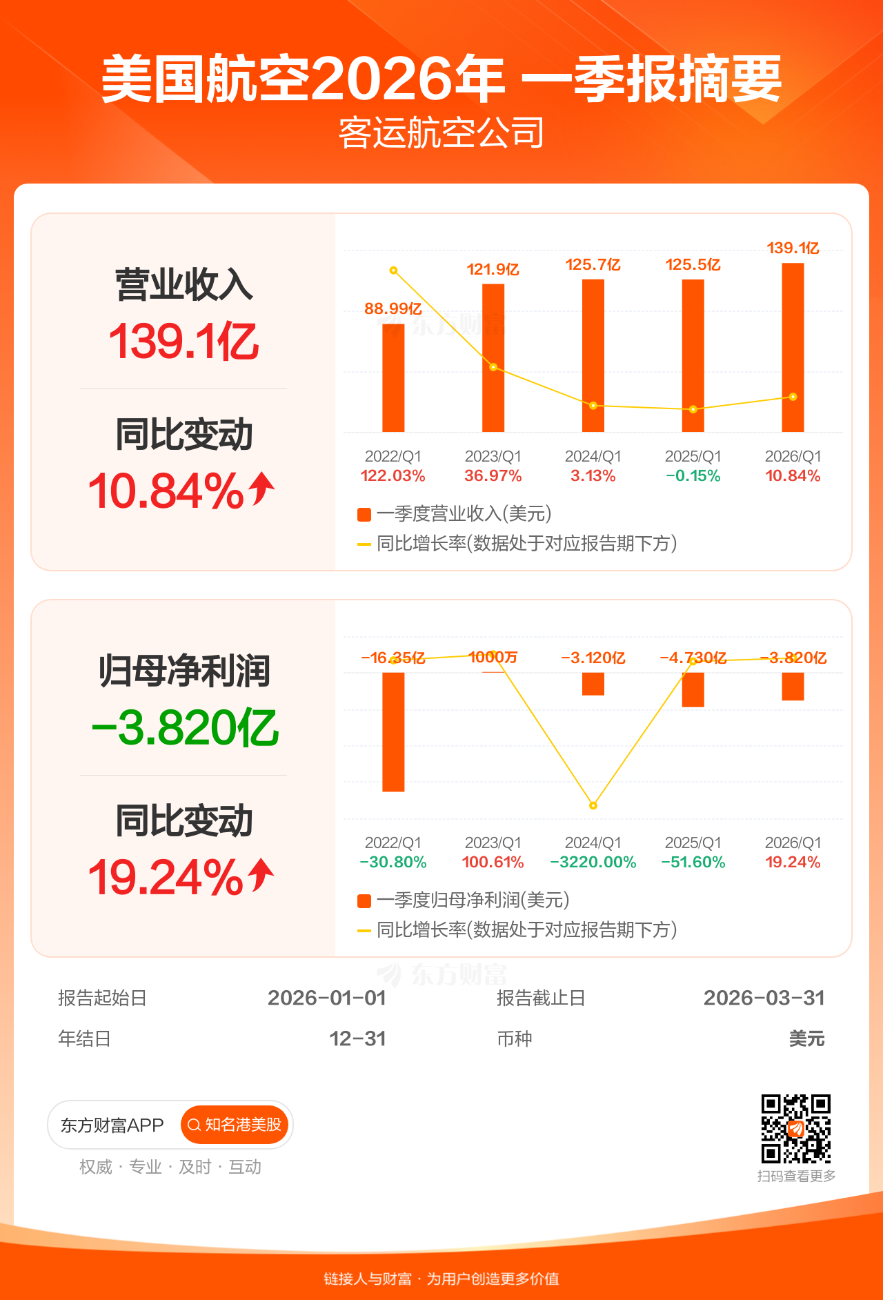 美国航空4月23日发布一季报业绩,截至2026年3月31日的3个月内,该公司营业收入139.12亿美元,同比增长10.84%;公司权益持有人应占溢利(归母净利润)-3.82亿美元,上年同期-4.73亿美元。