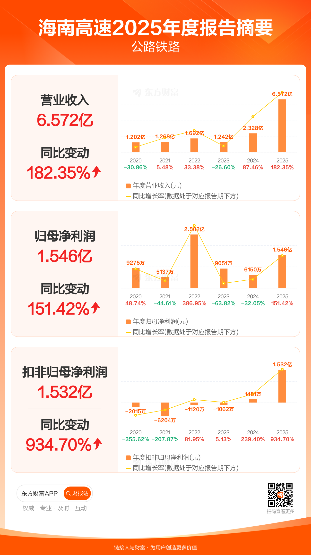 海南高速4月24日发布2025年年报显示,公司全年实现营业收入6.57亿元,同比增长182.35%;归母净利润1.55亿元,同比增长151.42%;扣非归母净利润1.53亿元,同比增长934.70%。