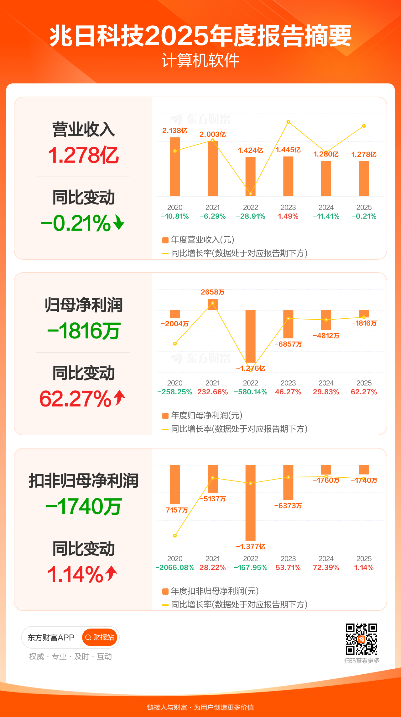兆日科技4月24日发布2025年年报显示,公司全年实现营业收入1.28亿元,同比下滑0.21%;归母净利润-1815.58万元;扣非归母净利润-1739.54万元。