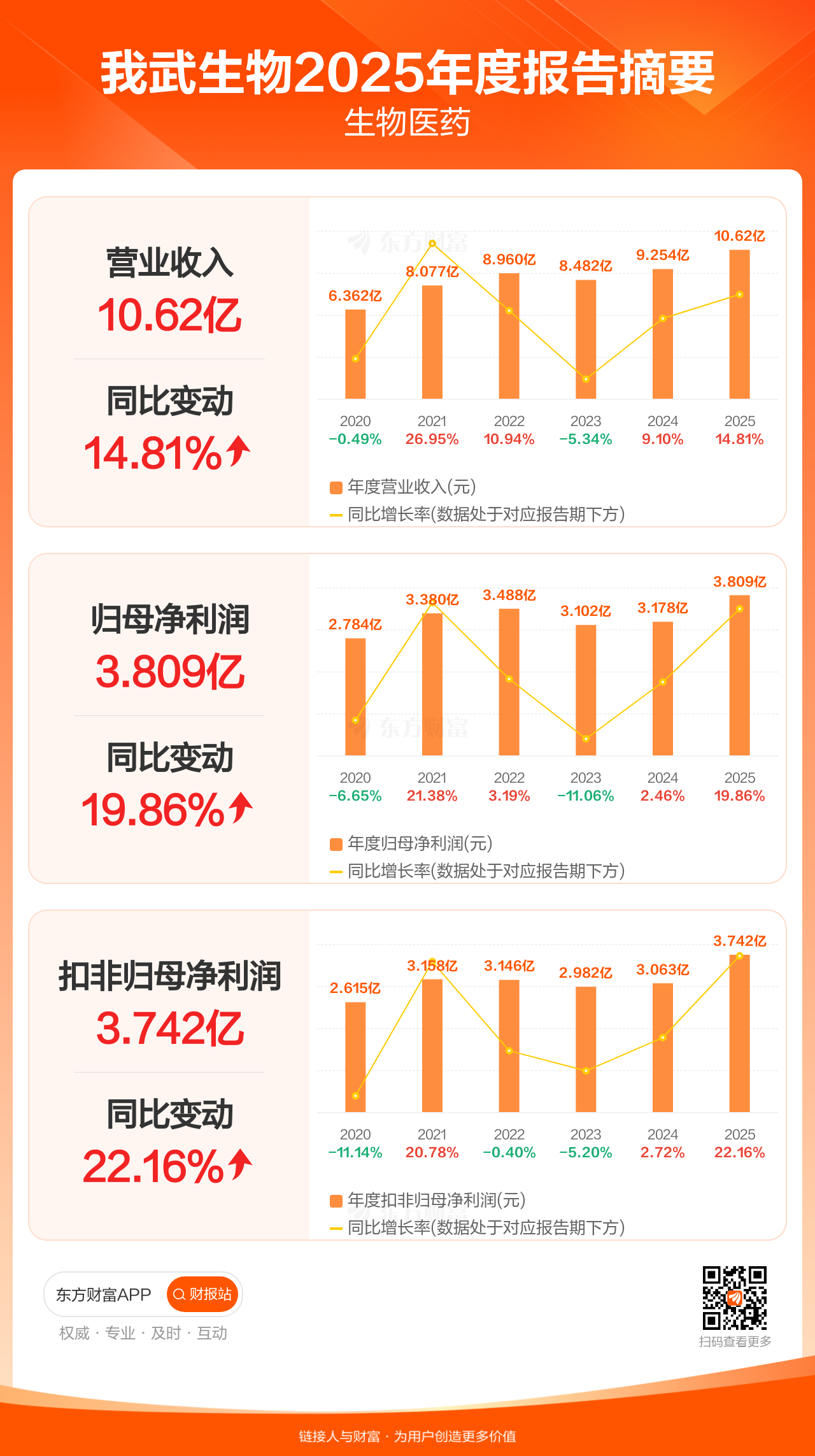 我武生物4月24日发布2025年年报显示,公司全年实现营业收入10.62亿元,同比增长14.81%;归母净利润3.81亿元,同比增长19.86%;扣非归母净利润3.74亿元,同比增长22.16%。