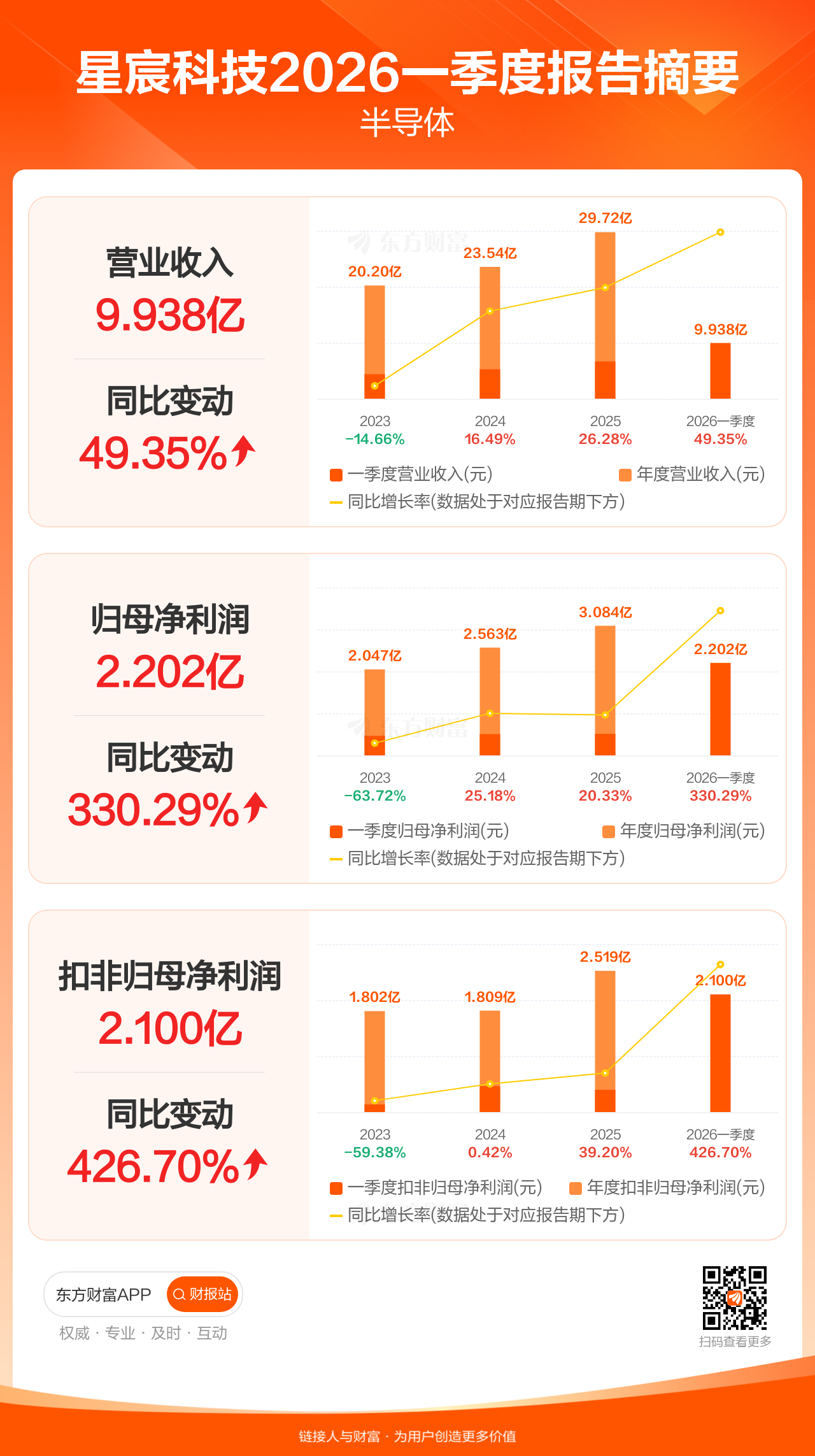 星宸科技4月24日发布2026年一季报显示,公司一季度实现营业收入9.94亿元,同比增长49.35%;归母净利润2.20亿元,同比增长330.29%;扣非归母净利润2.10亿元,同比增长426.70%。