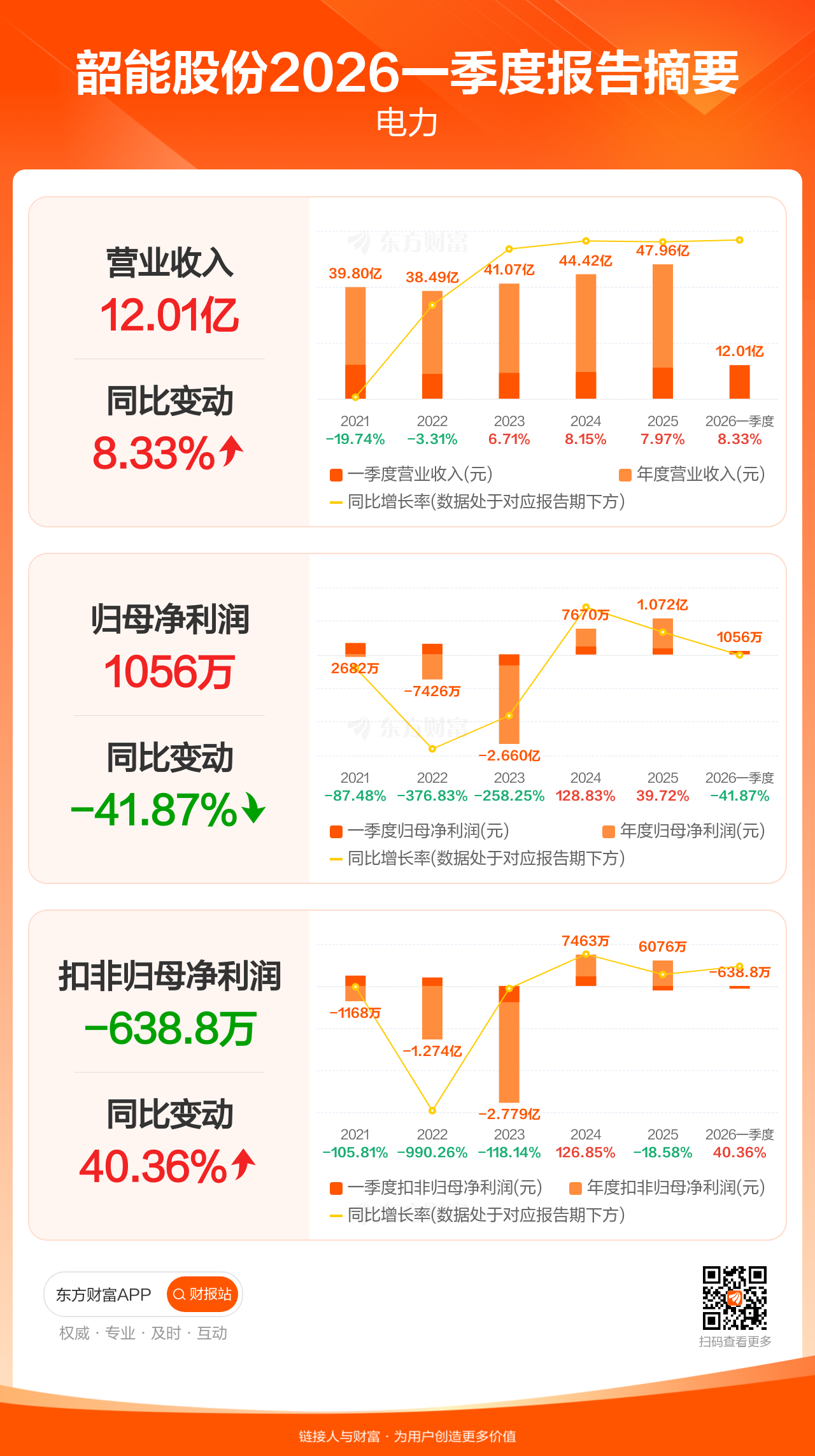 韶能股份4月24日发布2026年一季报显示,公司一季度实现营业收入12.01亿元,同比增长8.33%;归母净利润1055.74万元,同比下滑41.87%;扣非归母净利润-638.77万元。