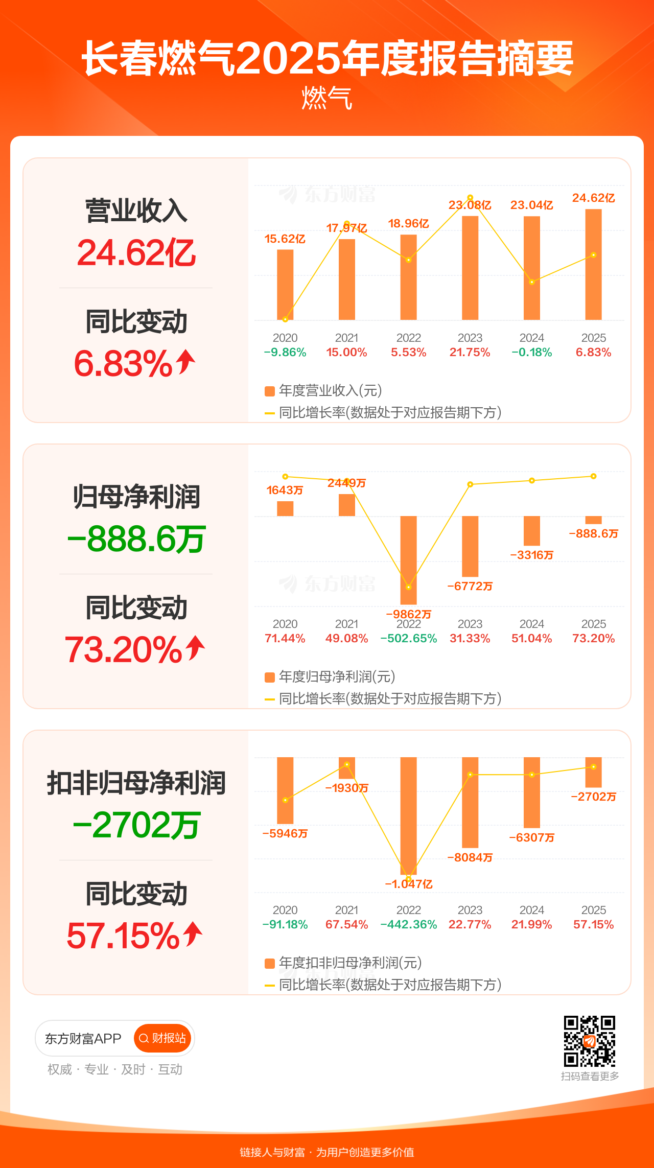 长春燃气4月24日发布2025年年报显示,公司全年实现营业收入24.62亿元,同比增长6.83%;归母净利润-888.57万元;扣非归母净利润-2702.26万元。