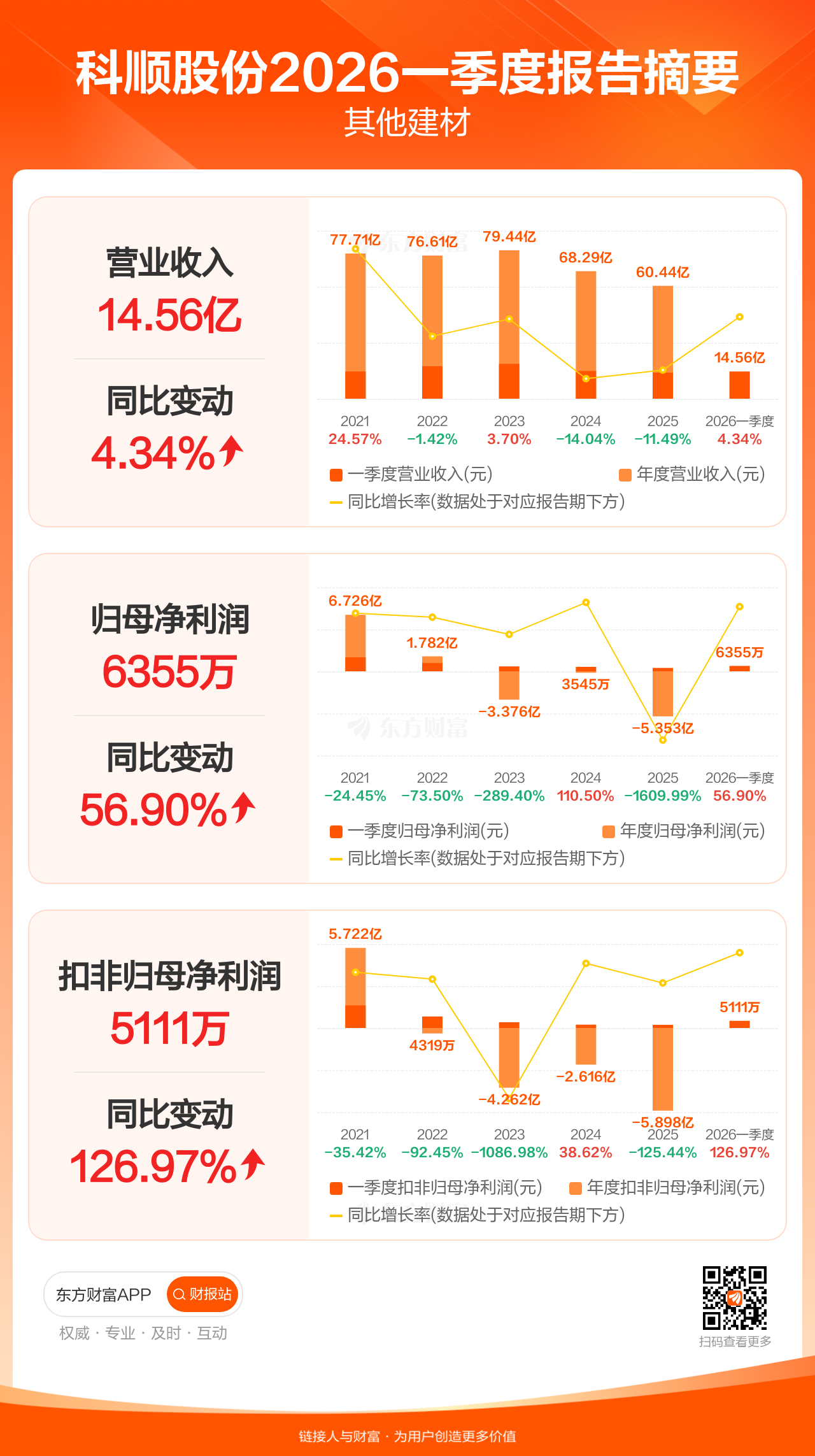 科顺股份4月24日发布2026年一季报显示,公司一季度实现营业收入14.56亿元,同比增长4.34%;归母净利润6355.24万元,同比增长56.90%;扣非归母净利润5110.51万元,同比增长126.97%。