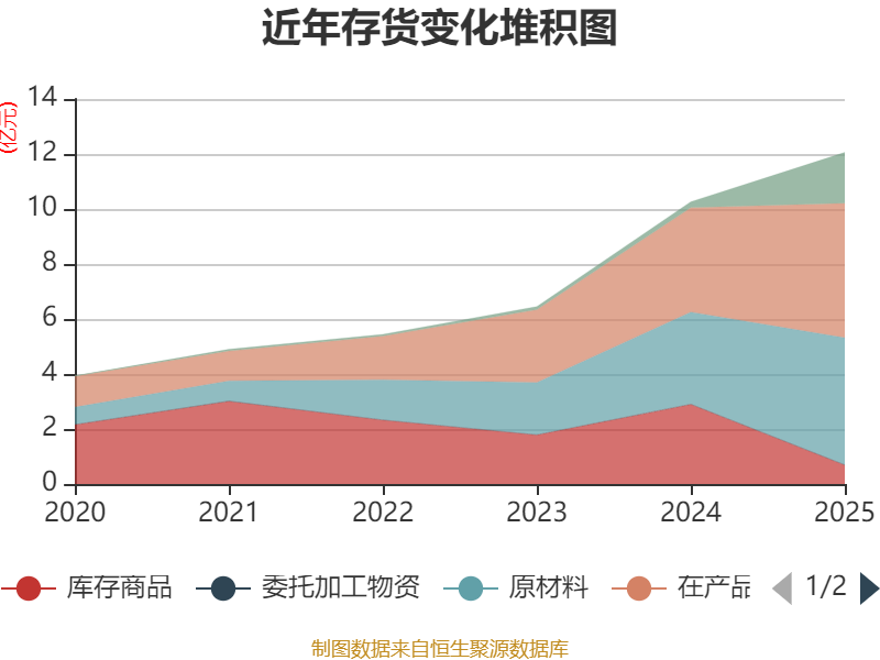 从存货变动来看,截至2025年末,公司存货账面价值为12.06亿元,占净资产的61.02%,较上年末增加1.79亿元。其中,存货跌价准备为6988.93万元,计提比例为5.48%。