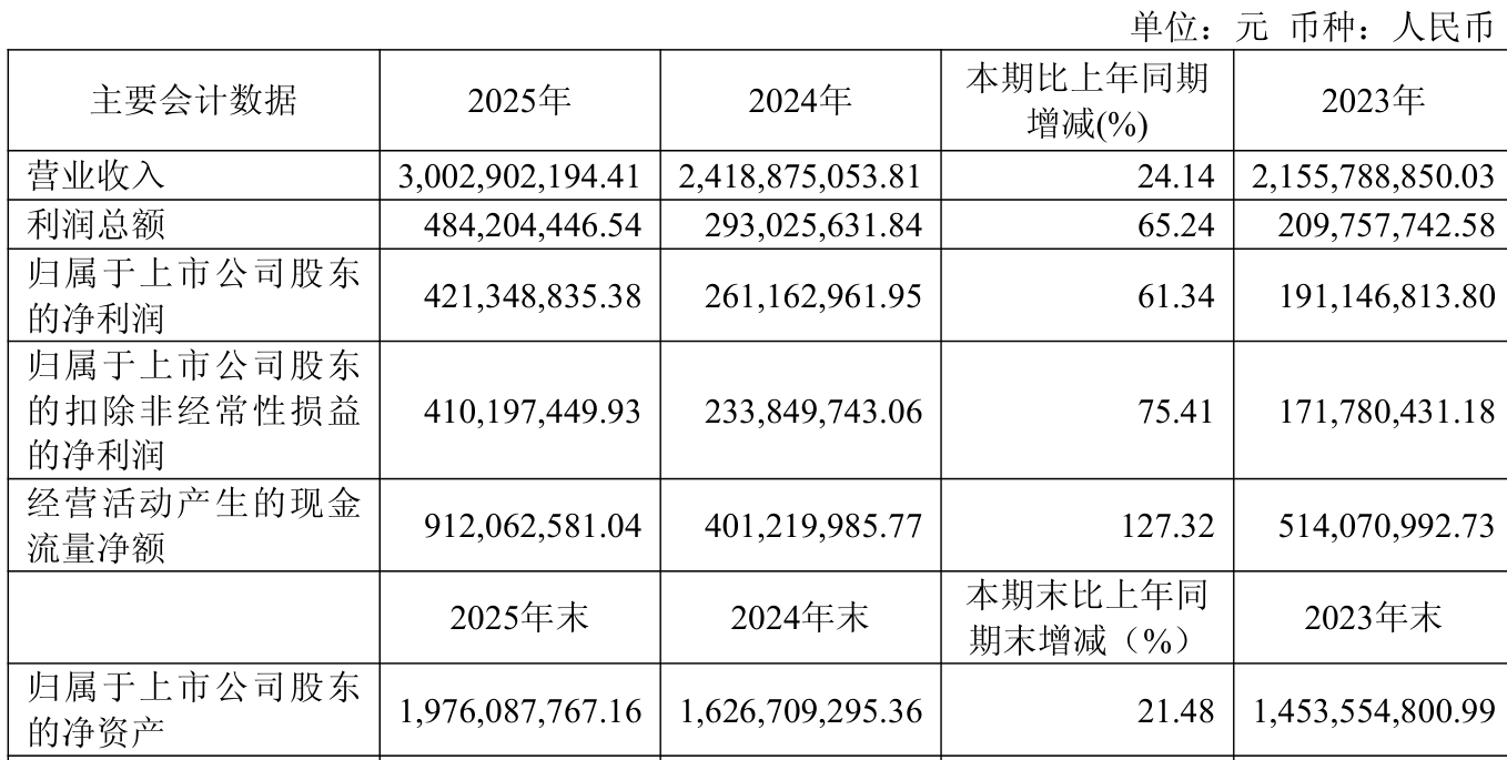 中证智能财讯福斯达(603173)4月24日披露2025年年度报告。2025年,公司实现营业总收入30.03亿元,同比增长24.14%;归母净利润4.21亿元,同比增长61.34%;扣非净利润4.1亿元,同比增长75.41%;经营活动产生的现金流量净额为9.12亿元,同比增长127.32%;报告期内,福斯达基本每股收益为2.66元,加权平均净资产收益率为23.48%。公司2025年度分配预案为:拟向全体股东每10股派现8.2元(含税)。