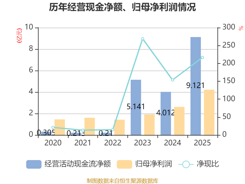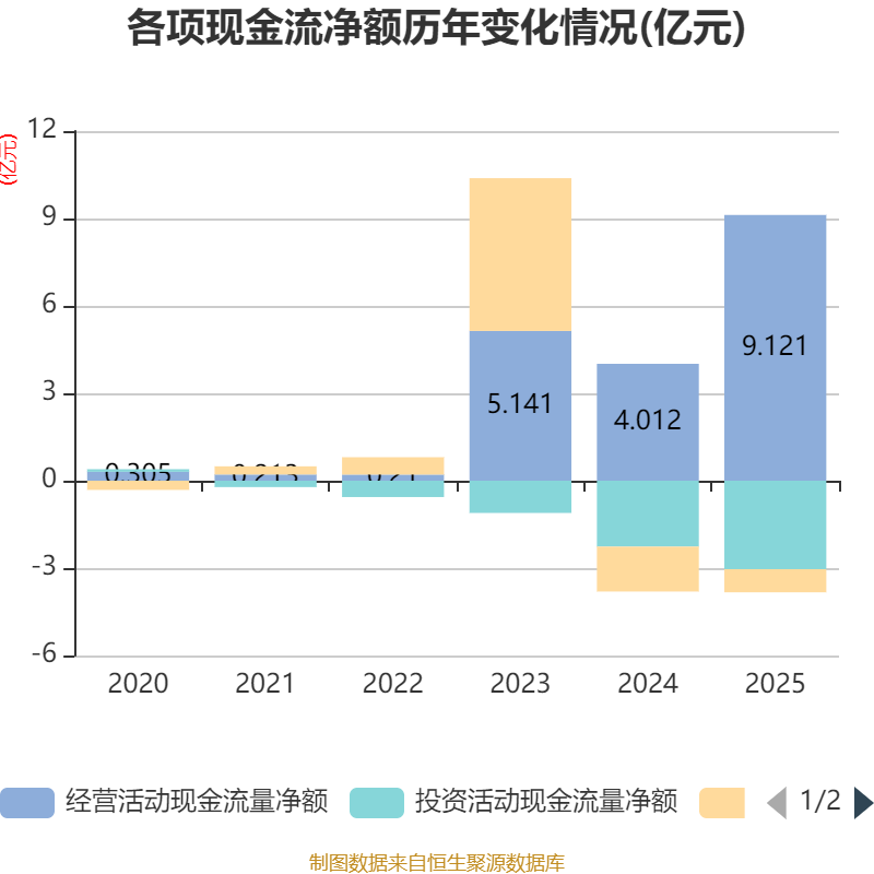 截至2025年,公司经营活动现金流净额为9.12亿元,同比增长127.32%;筹资活动现金流净额-7937.59万元,同比增加7471.15万元;投资活动现金流净额-3.04亿元,上年同期为-2.26亿元。