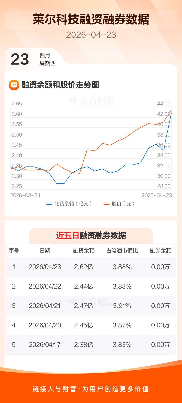 交易所最新数据显示,莱尔科技于2026年4月23日获融资买入2550.02万元,融资偿还808.15万元,当日融资净买入1741.88万元。目前,该股融资余额2.62亿,占流通市值比例为3.88%。