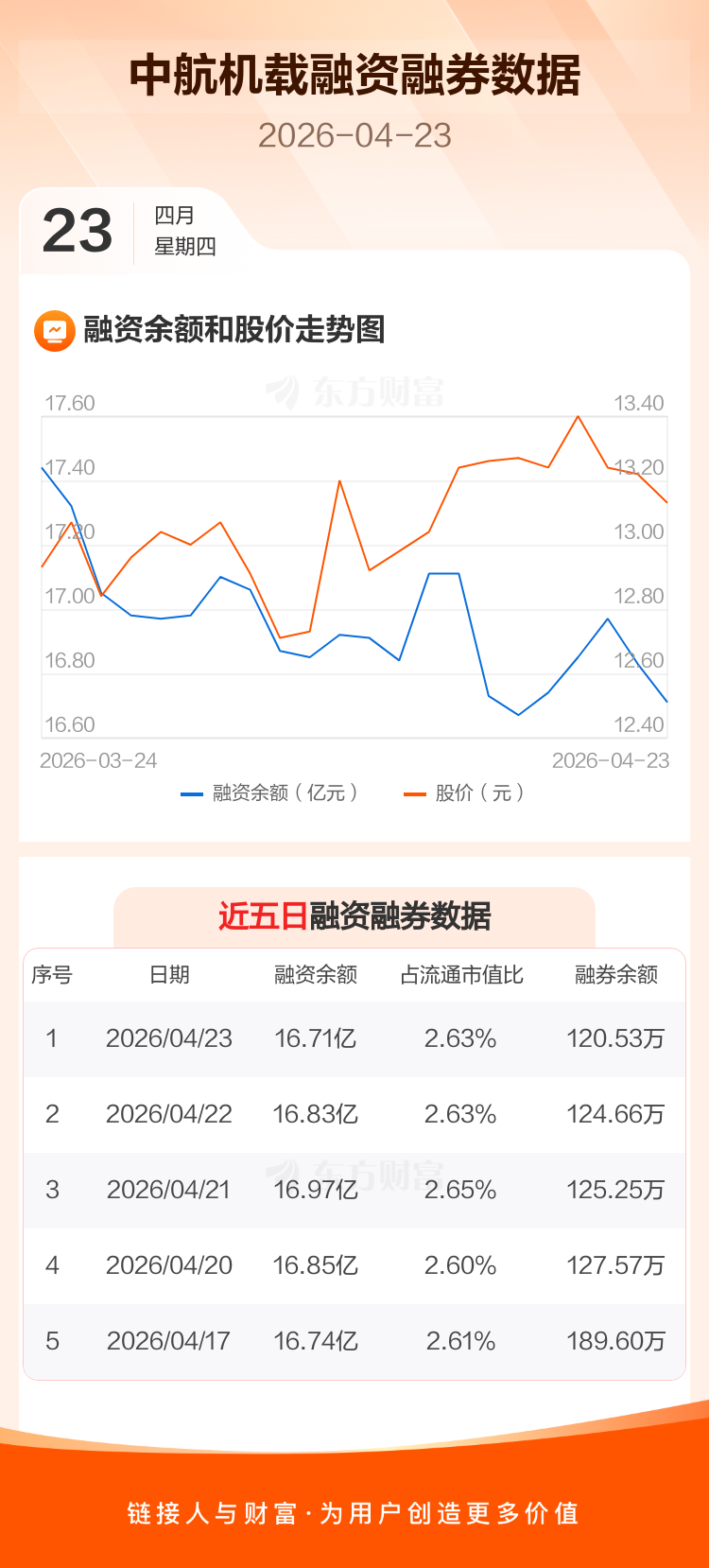 交易所最新数据显示,中航机载于2026年4月23日获融资买入5595.61万元,融资偿还6850.95万元,当日融资净偿还1255.34万元。目前,该股融资余额16.71亿,占流通市值比例为2.63%。