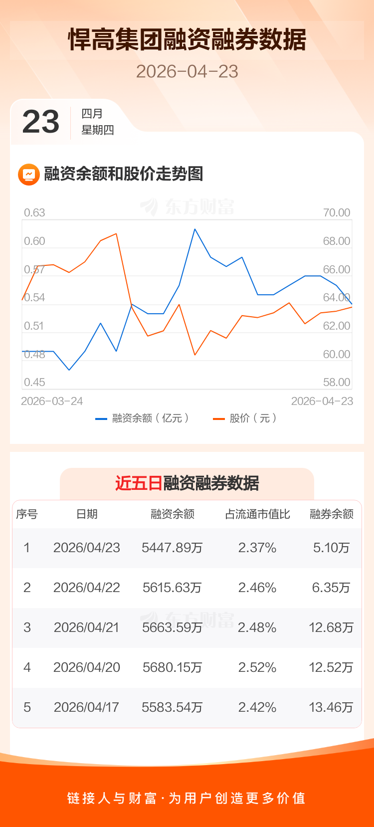 交易所最新数据显示,悍高集团于2026年4月23日获融资买入309.97万元,融资偿还477.71万元,当日融资净偿还167.74万元。目前,该股融资余额5447.89万,占流通市值比例为2.37%。