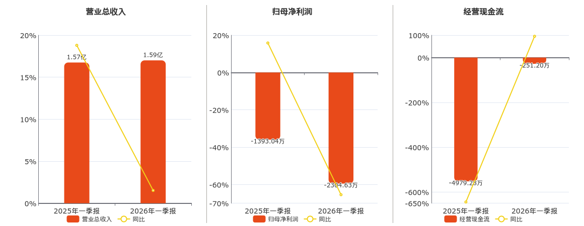 公司营业总收入为1.59亿元。归母净利润为-2304.63万元,较去年同报告期归母净利润减少911.59万元。经营活动现金净流入为-251.20万元。