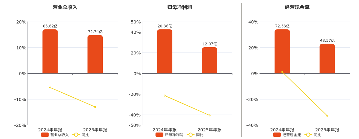 公司截至2025年12月31日,*ST新潮营业总收入为72.74亿元,在已披露的同业公司中排名第2,较去年同报告期营业总收入减少10.88亿元,同比较去年同期下降13.01%。截至2025年12月31日,*ST新潮归母净利润为12.07亿元,在已披露的同业公司中排名第2,较去年同报告期归母净利润减少8.28亿元,同比较去年同期下降40.69%。截至2025年12月31日,*ST新潮经营活动现金净流入为48.57亿元,在已披露的同业公司中排名第2,较去年同报告期经营活动现金净流入减少23.76亿元,同比较去年同期下降32.84%。