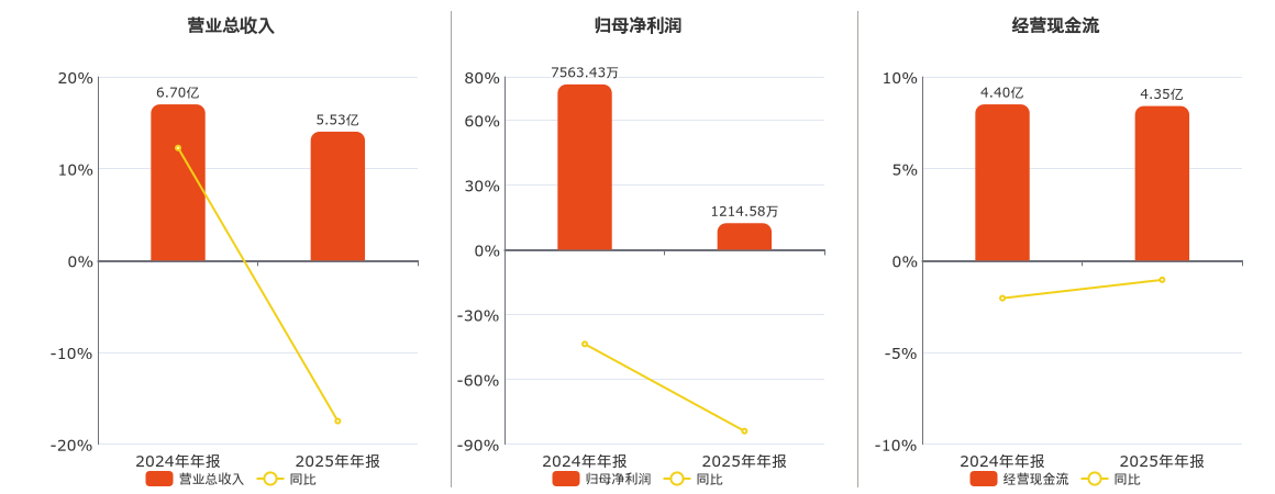 公司营业总收入为5.53亿元,在已披露的同业公司中排名第12,较去年同报告期营业总收入减少1.17亿元,同比较去年同期下降17.48%。归母净利润为1214.58万元,较去年同报告期归母净利润减少6348.85万元,同比较去年同期下降83.94%。经营活动现金净流入为4.35亿元,较去年同报告期经营活动现金净流入减少463.46万元,同比较去年同期下降1.05%。