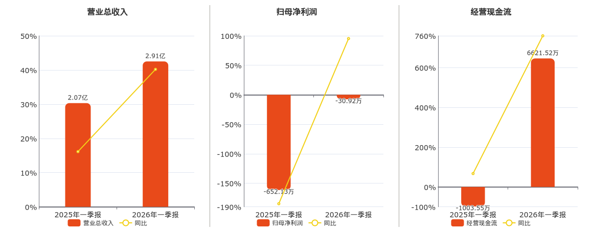 公司营业总收入为2.91亿元。归母净利润为-30.92万元。经营活动现金净流入为6621.52万元。