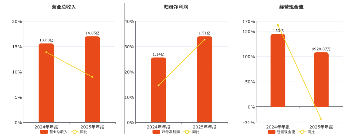 公司营业总收入为14.85亿元,在已披露的同业公司中排名第17。归母净利润为1.51亿元。经营活动现金净流入为9928.87万元,在已披露的同业公司中排名第14,较去年同报告期经营活动现金净流入减少3344.54万元,同比较去年同期下降25.20%。