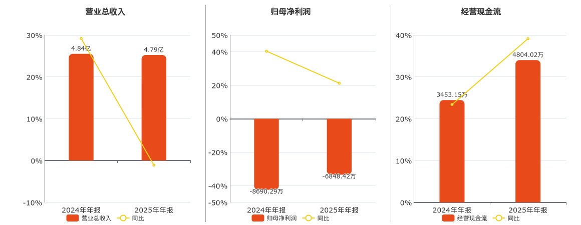 公司营业总收入为4.79亿元,在已披露的同业公司中排名第56,较去年同报告期营业总收入减少535.40万元,同比较去年同期下降1.11%。归母净利润为-6848.42万元,在已披露的同业公司中排名第60。经营活动现金净流入为4804.02万元,在已披露的同业公司中排名第42。