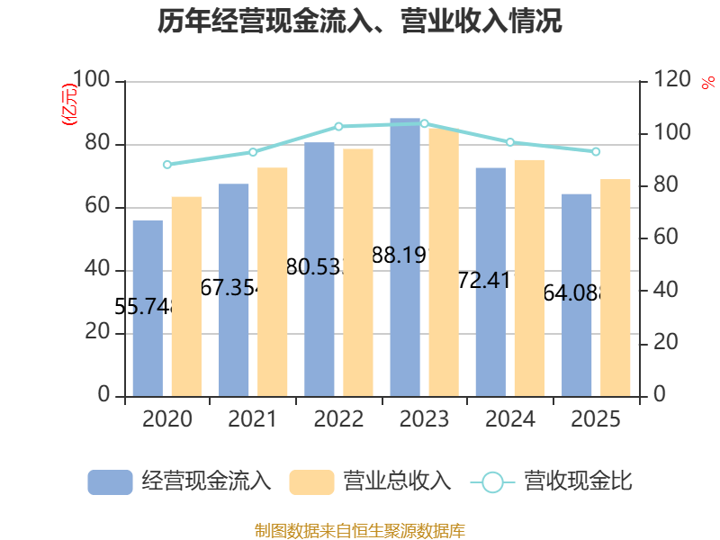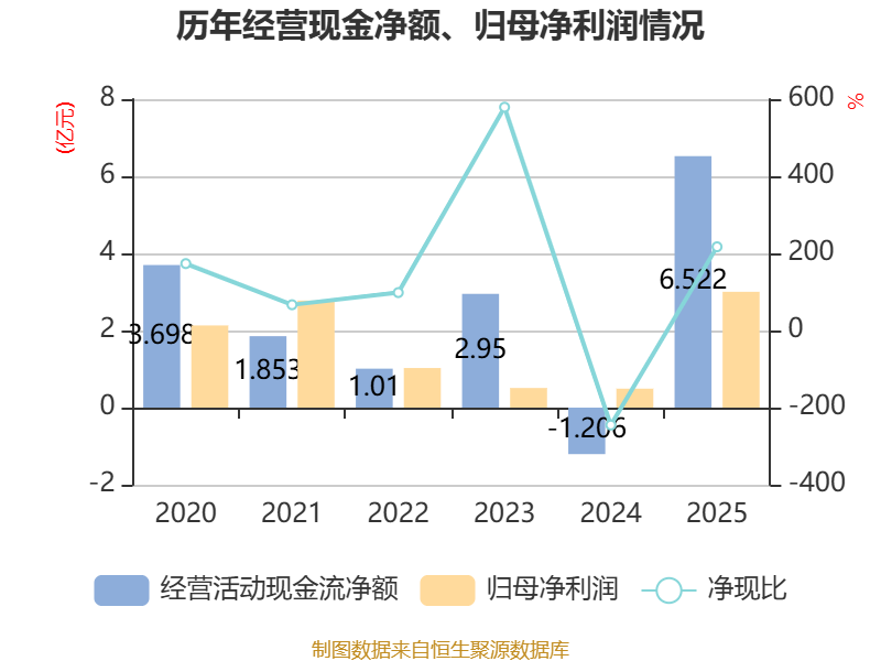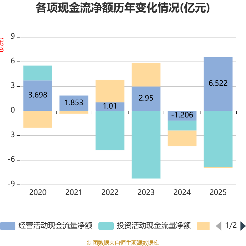 截至2025年,公司经营活动现金流净额为6.52亿元,同比增加7.73亿元;筹资活动现金流净额-1126.01万元,同比增加1.8亿元;投资活动现金流净额-6.88亿元,上年同期为-1.22亿元。