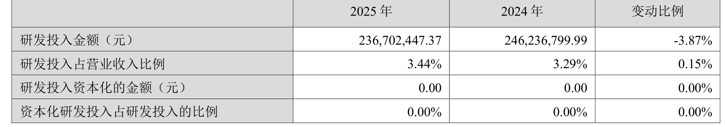 2025年全年,公司研发投入金额为2.37亿元,同比下降3.87%;研发投入占营业收入比例为3.44%,相比上年同期上升0.15个百分点。此外,公司全年研发投入资本化率为0%。
