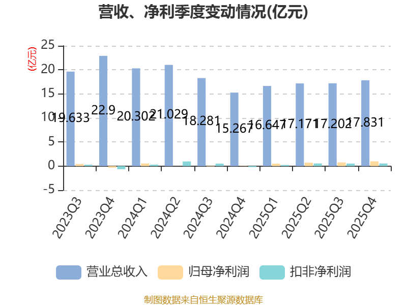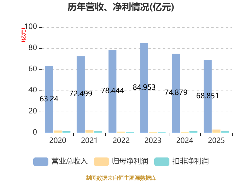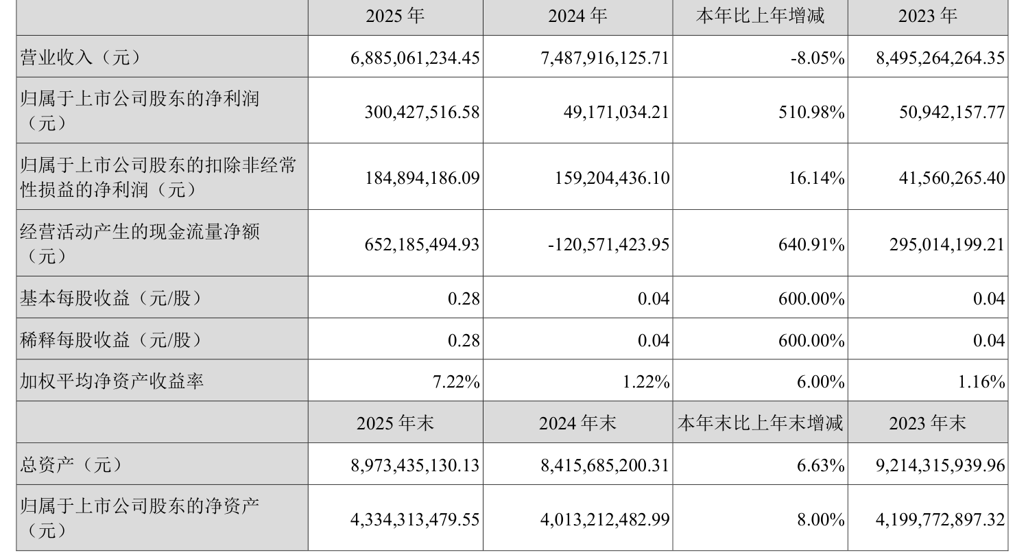 中证智能财讯海联金汇(002537)4月24日披露2025年年度报告。2025年,公司实现营业总收入68.85亿元,同比下降8.05%;归母净利润3亿元,同比增长510.98%;扣非净利润1.85亿元,同比增长16.14%;经营活动产生的现金流量净额为6.52亿元,上年同期为-1.21亿元;报告期内,海联金汇基本每股收益为0.28元,加权平均净资产收益率为7.22%。