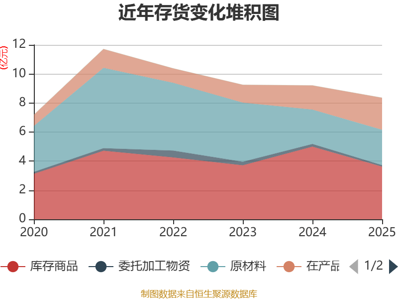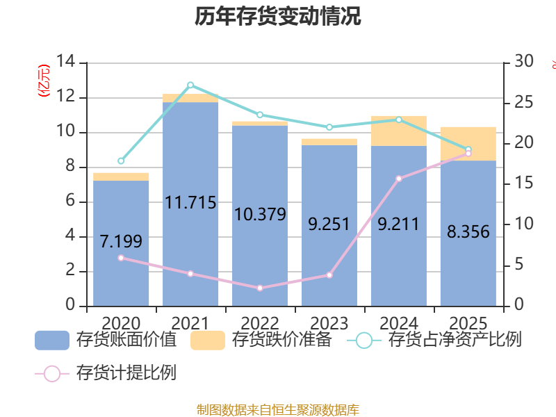 从存货变动来看,截至2025年末,公司存货账面价值为8.36亿元,占净资产的19.28%,较上年末减少8546.97万元。其中,存货跌价准备为1.93亿元,计提比例为18.78%。