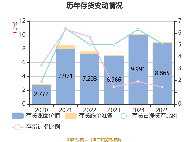 从存货变动来看,截至2025年末,公司存货账面价值为8.87亿元,占净资产的5.11%,较上年末减少1.13亿元。其中,存货跌价准备为1296.72万元,计提比例为1.44%。