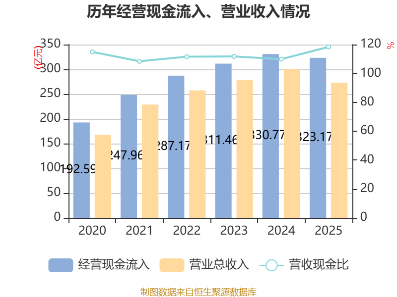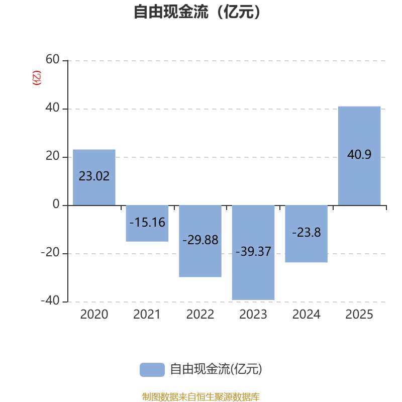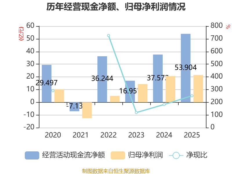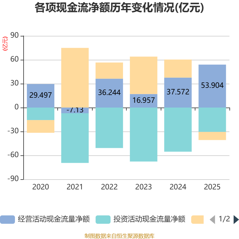 截至2025年,公司经营活动现金流净额为53.9亿元,同比增长43.47%;筹资活动现金流净额-10.17亿元,同比减少32.84亿元;投资活动现金流净额-30.6亿元,上年同期为-55.39亿元。