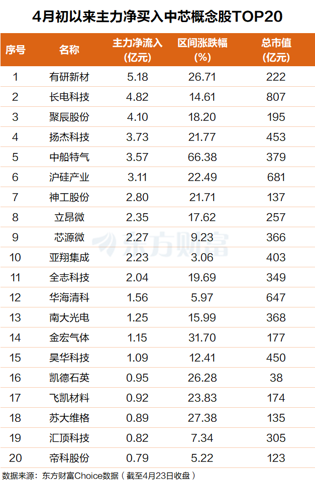 东方财富Choice数据显示,自今年4月初以来,主力资金净买入20只中芯概念股,其中有研新材排名第一,主力净买入超5亿元;长电科技排名第二,主力净买入4.9亿元。