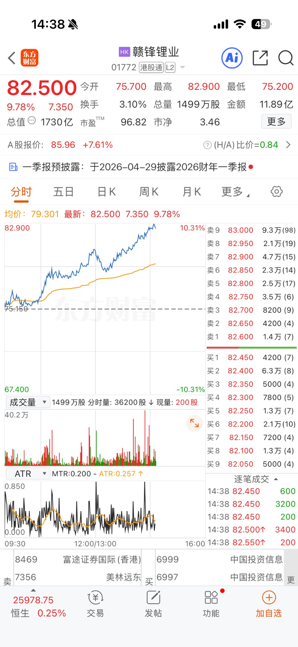 上证报中国证券网讯(记者何治民)4月24日,赣锋锂业H股震荡走强,一度涨超10%,截至14时38分,H股涨9.78%,报82.35港元/股,A股涨7.61%,报85.96元/股。