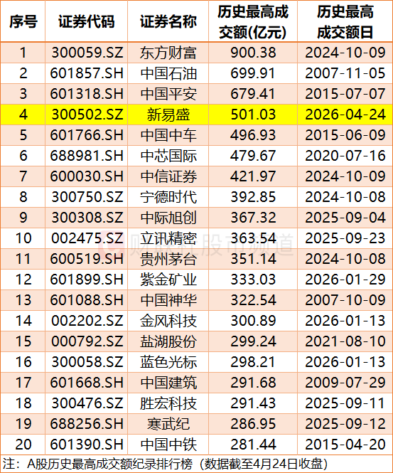 受昨日晚间一季报业绩不及预期影响,CPO板块龙头新易盛今日放量大跌,截至收盘,该股跌幅达11.67%,单日跌幅创2025年9月4日以来新高。同时,其全天成交额高达501.03亿元,不仅刷新其上市以来最高纪录,同时在今日A股成交额榜单中位居第一。纵观A股历史,这一成交额位列第四,仅次于东方财富、中国石油与中国平安。