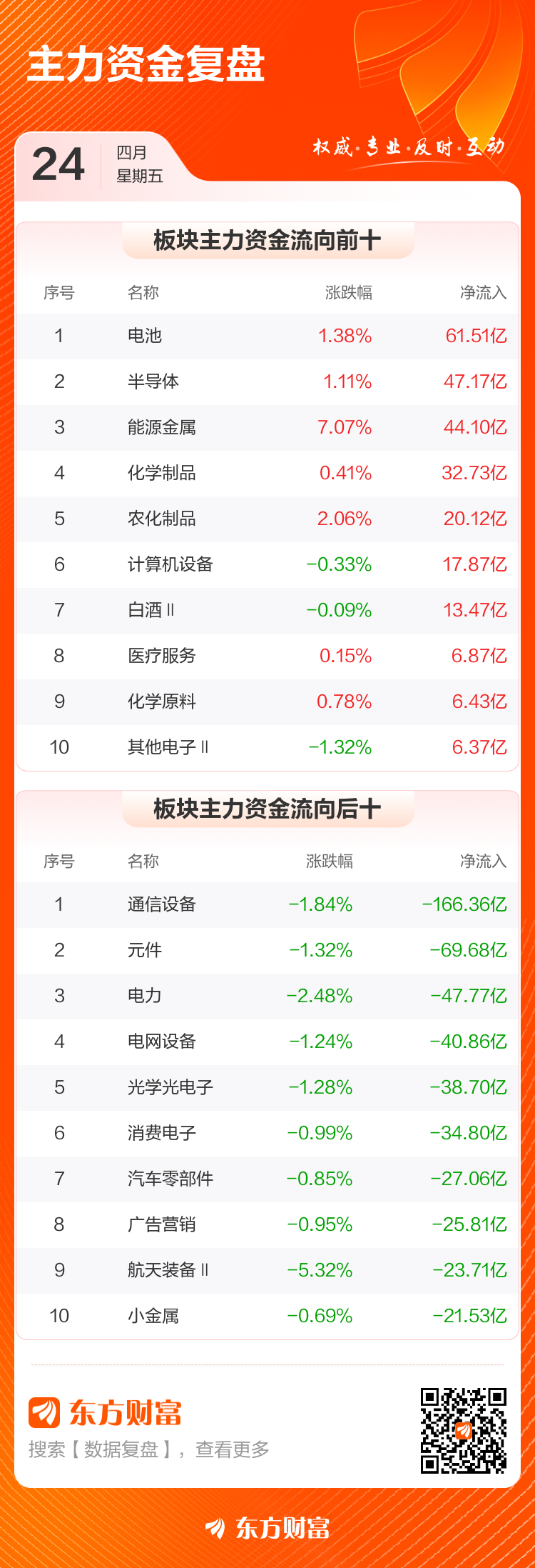 4月24日,沪指跌0.33%,深成指跌0.69%,创业板指跌1.41%。两市成交额2.64万亿,较上个交易日缩量1626亿。数据显示,今日大盘主力资金净流出574.03亿。电池、半导体、能源金属等板块主力资金流入排名居前,其中电池净流入61.51亿元。