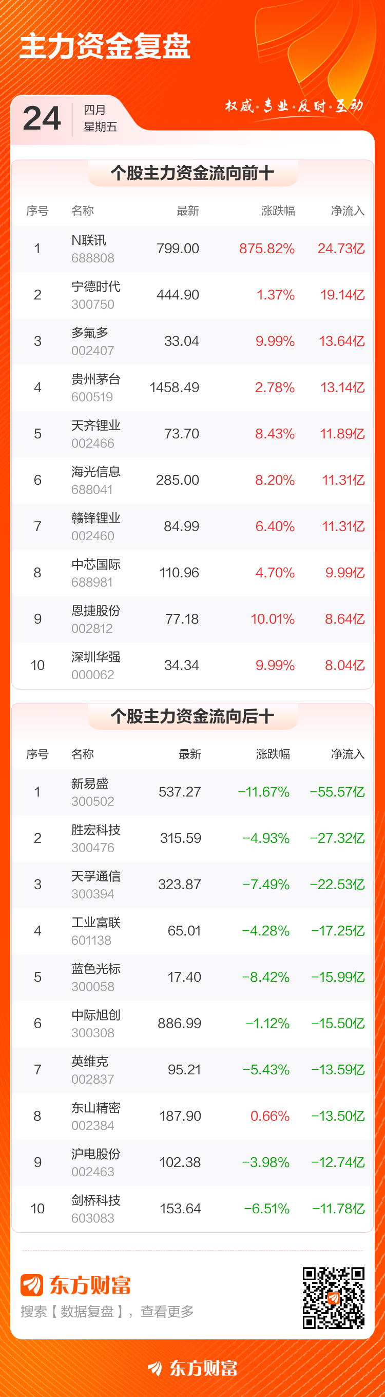 主力净买入个股中,N联讯排名第一,主力净买入24.73亿元;宁德时代排名第二,主力净买入19.14亿元。