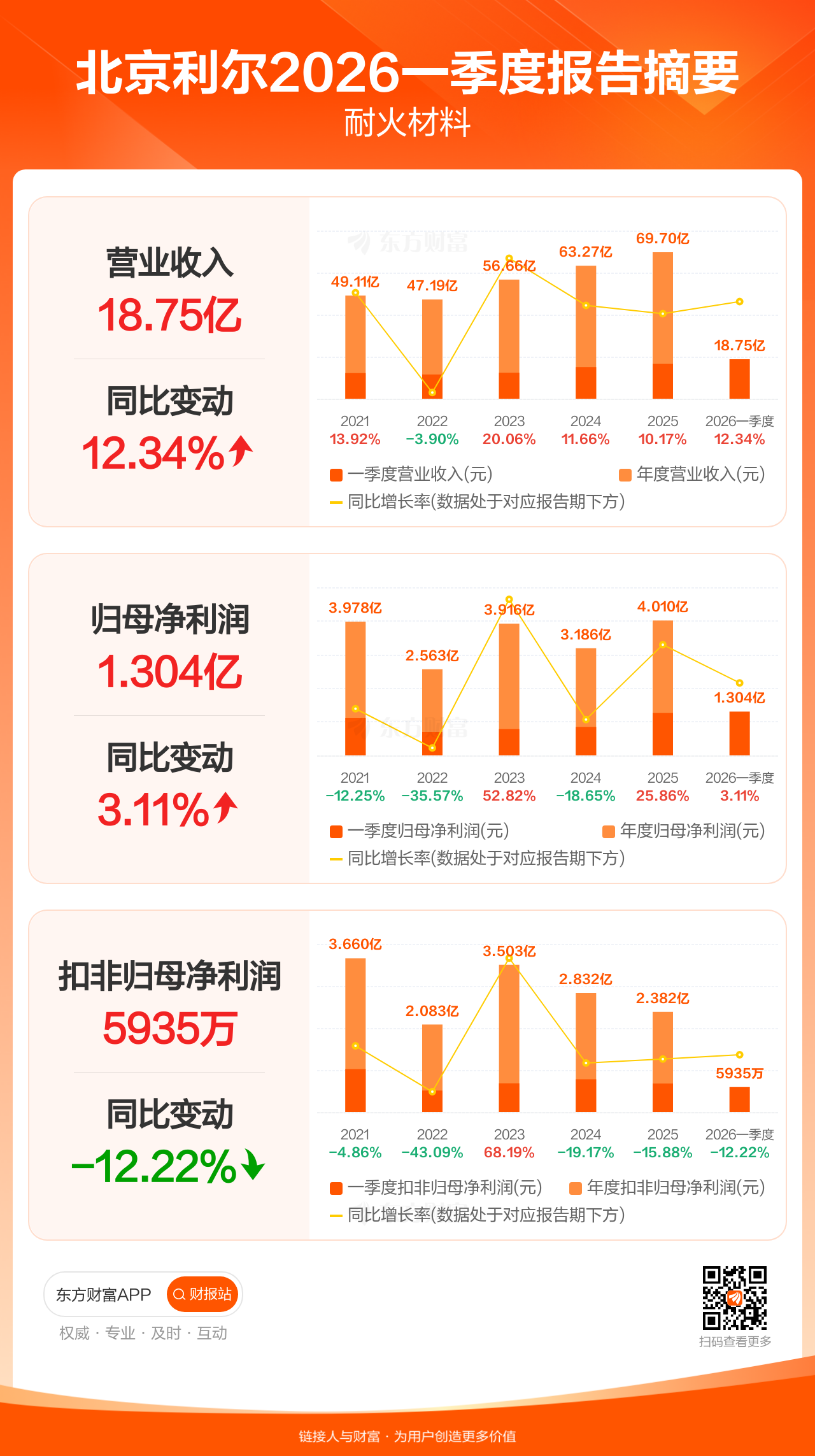 北京利尔4月25日发布2026年一季报显示,公司一季度实现营业收入18.75亿元,同比增长12.34%;归母净利润1.30亿元,同比增长3.11%;扣非归母净利润5935.25万元,同比下滑12.22%。