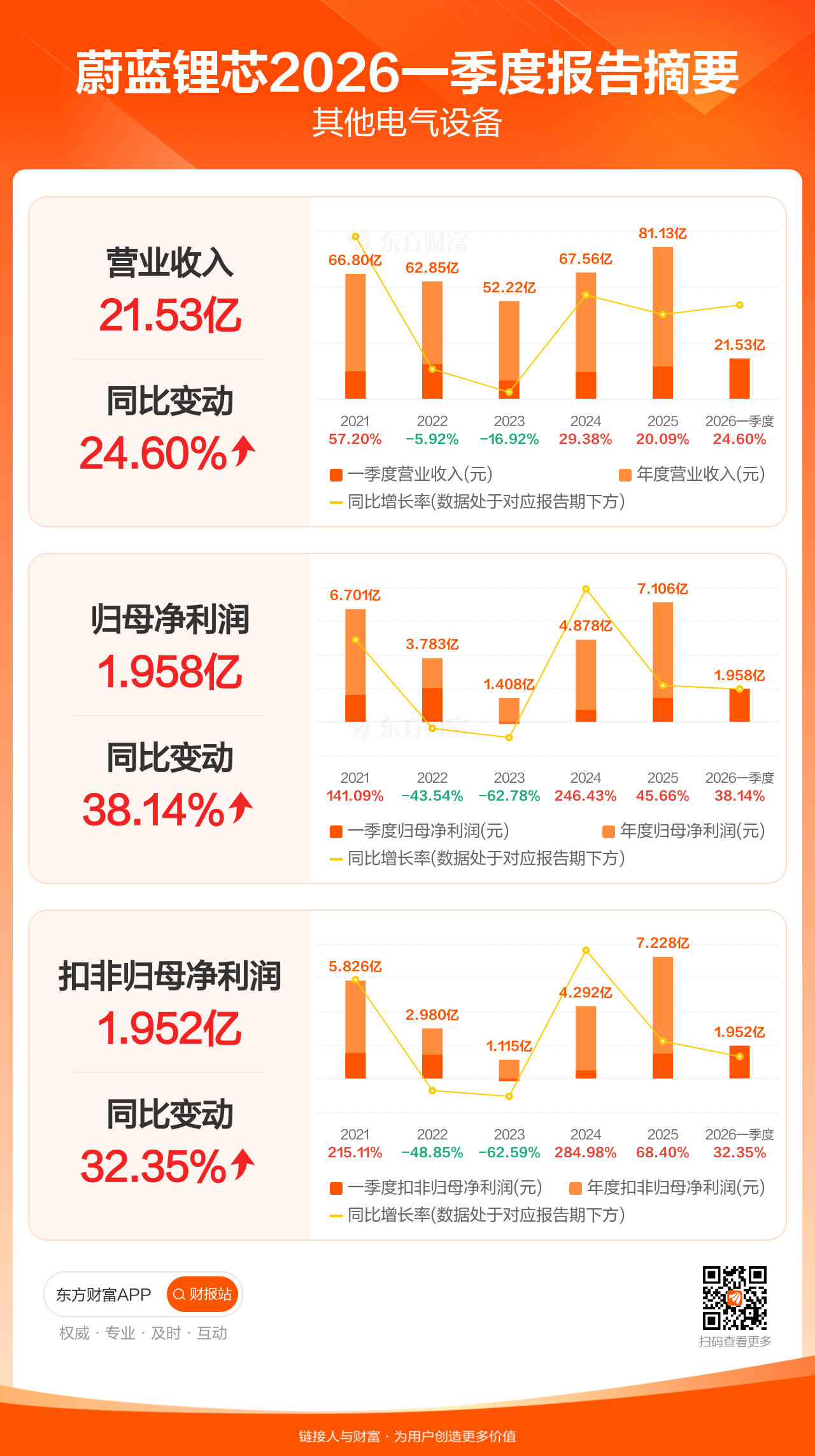 蔚蓝锂芯4月25日发布2026年一季报显示,公司一季度实现营业收入21.53亿元,同比增长24.60%;归母净利润1.96亿元,同比增长38.14%;扣非归母净利润1.95亿元,同比增长32.35%。