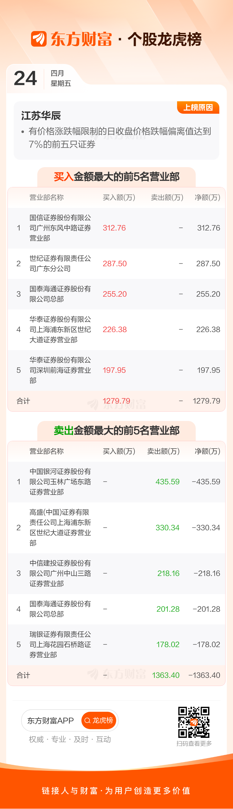 交易所2026年4月24日公布的交易公开信息显示,江苏华辰因成为有价格涨跌幅限制的日收盘价格跌幅偏离值达到7%的前五只证券上榜。江苏华辰当日收报29.42元,涨跌幅-10.00%,偏离值-9.68%,换手率2.30%,成交额1.09亿。