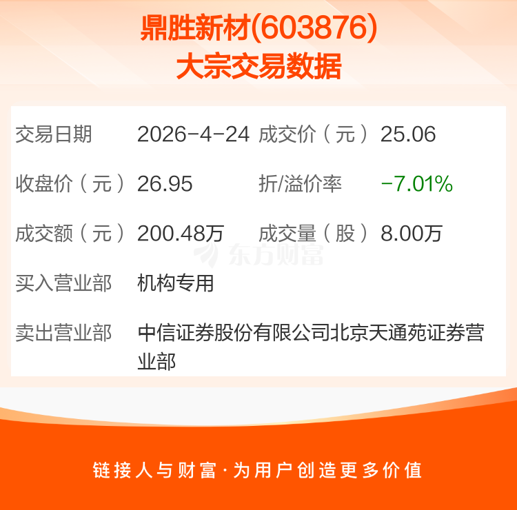 2026年4月24日,鼎胜新材发生1笔大宗交易,共成交8.00万股,成交金额200.48万元。