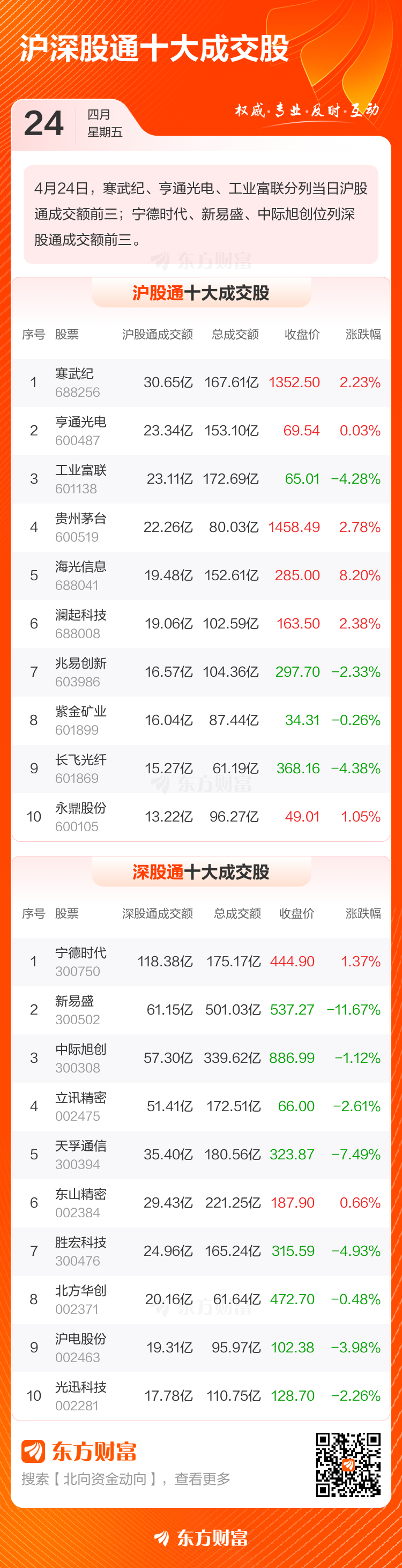4月24日北向资金最新动向(附十大成交股)