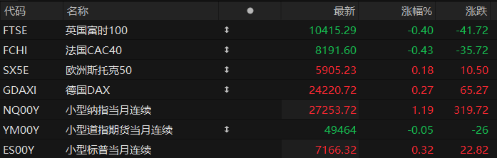 周五盘前,美伊谈判出现新转折,纳指、标普期货盘前走高,欧洲主要指数涨跌不一。截至发稿,纳斯达克100指数期货涨1.19%,道指期货跌0.05%,标普500指数期货涨0.32%。