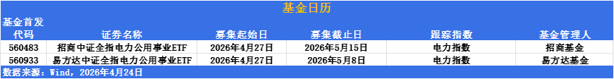招商中证全指电力公用事业ETF(560483)与易方达中证全指电力公用事业ETF(560933)将于2026年4月27日起同步公开发售,募集期分别持续至5月15日、5月8日。两只产品均紧密跟踪中证全指电力公用事业指数,由中证指数有限公司编制,选取沪深两市中业务涉及电力生产、供应及公用事业等领域的龙头上市公司作为样本,以反映电力公用事业主题上市公司的整体表现。
