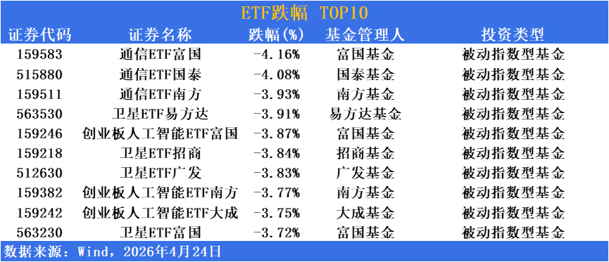 跌幅方面,通信板块高位回落,通信主题ETF大幅回调