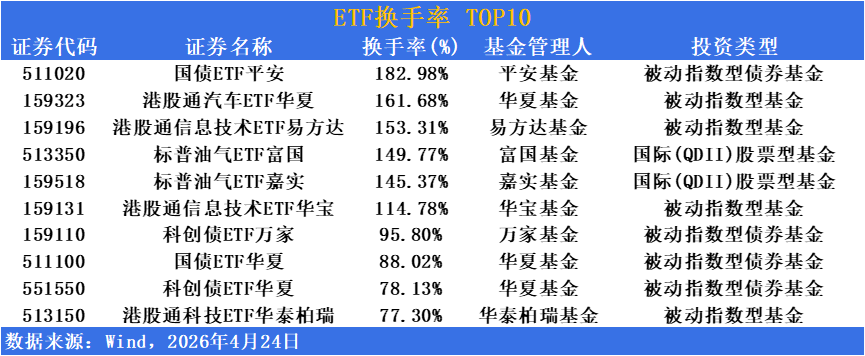 活跃度方面,短融ETF成交超664亿位居榜首,国债ETF平安换手率超182%高居榜首