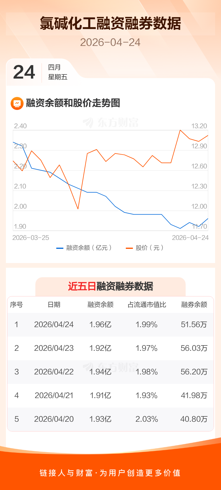 交易所最新数据显示,氯碱化工于2026年4月24日获融资买入2019.06万元,融资偿还1609.47万元,当日融资净买入409.59万元。目前,该股融资余额1.96亿,占流通市值比例为1.99%。