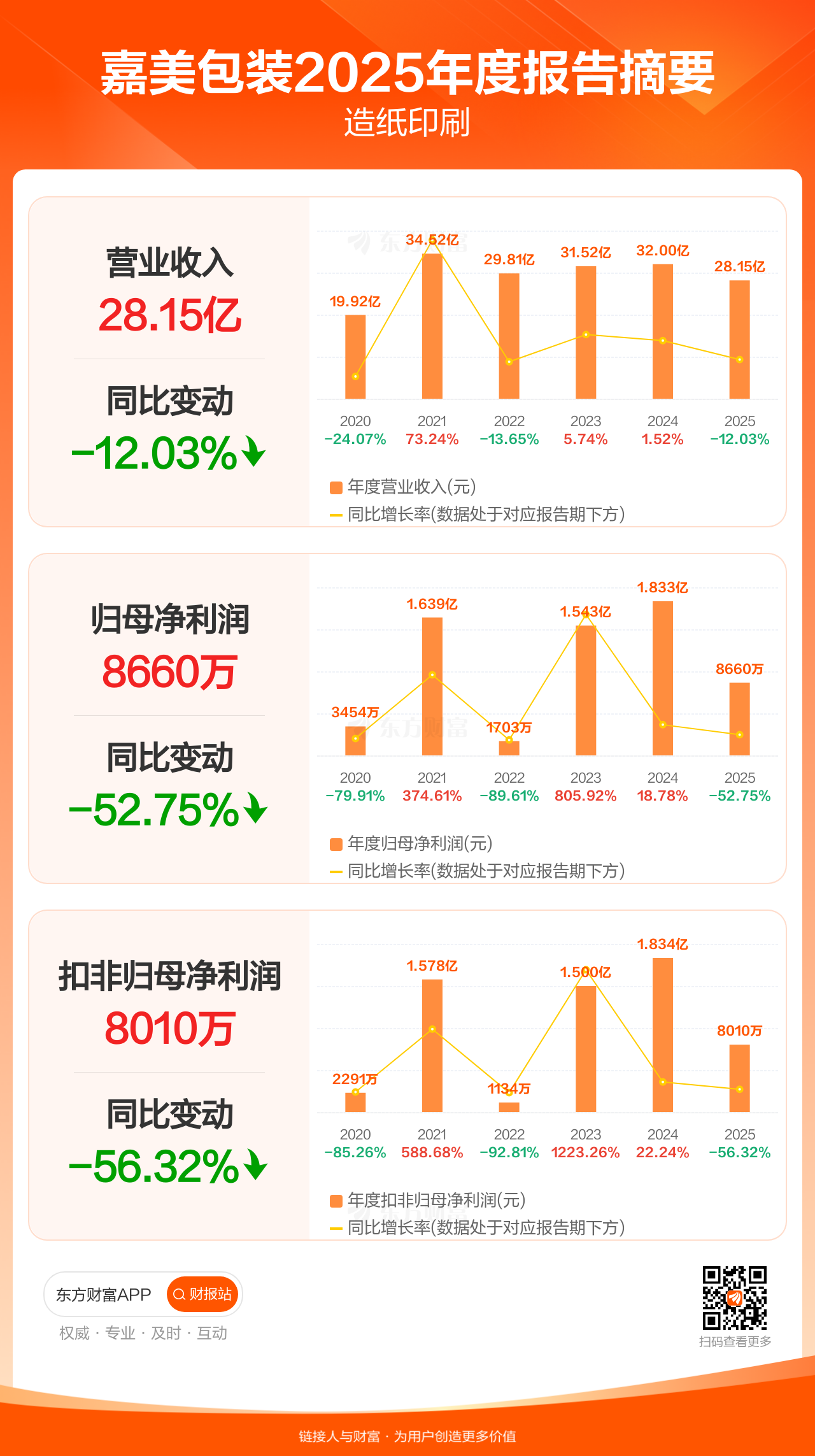 嘉美包装4月27日发布2025年年报显示,公司全年实现营业收入28.15亿元,同比下滑12.03%;归母净利润8660.02万元,同比下滑52.75%;扣非归母净利润8009.81万元,同比下滑56.32%。